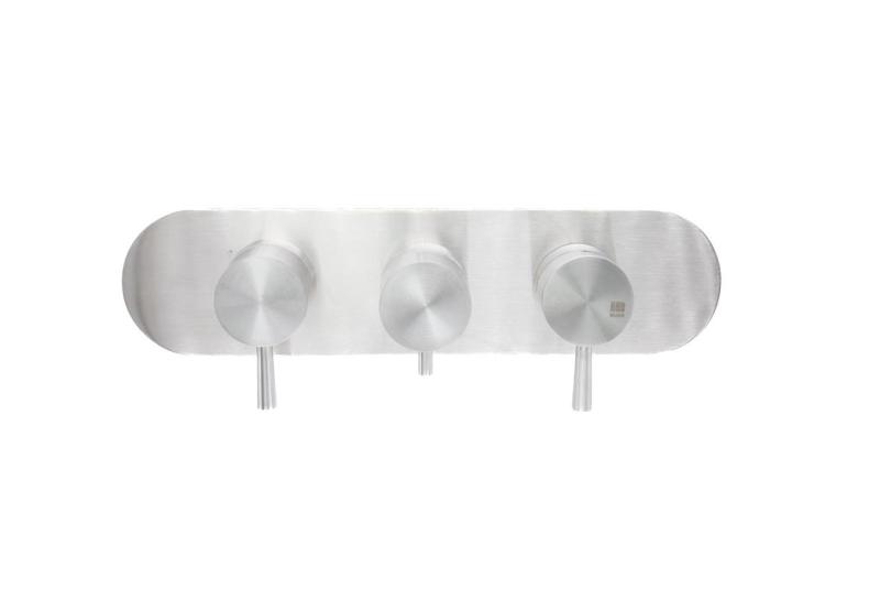 Due rubinetti di arresto separati consentono di controllare le uscite dell'acqua collegate in modo indipendente l'una dall'altra, come la doccia principale e la doccetta. Ciò offre una flessibilità e un controllo ottimali sul comfort e sul consumo di acqua. Il comando avviene tramite eleganti maniglie a leva, mentre la rosetta quadrata da 80 x 80 mm garantisce una finitura della parete elegante e moderna.